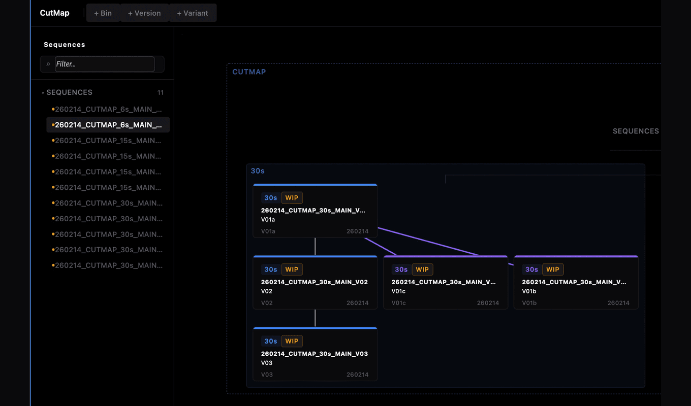 Projects grow and editorial structure becomes hard to follow: versions branch, new options appear, variants pile up. Sequences get renamed, duplicated, and reshaped—before long it gets difficult to tell what came from where, what changed, and what is actually current.