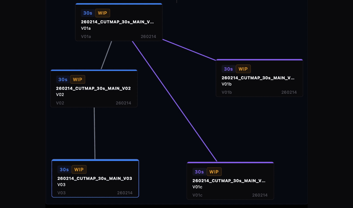 CutMap makes structure visible. See how sequences relate, how versions evolve, and how your project is organized beneath the surface. Visualize relationships across versions and branches so editorial teams can keep moving without confusion.